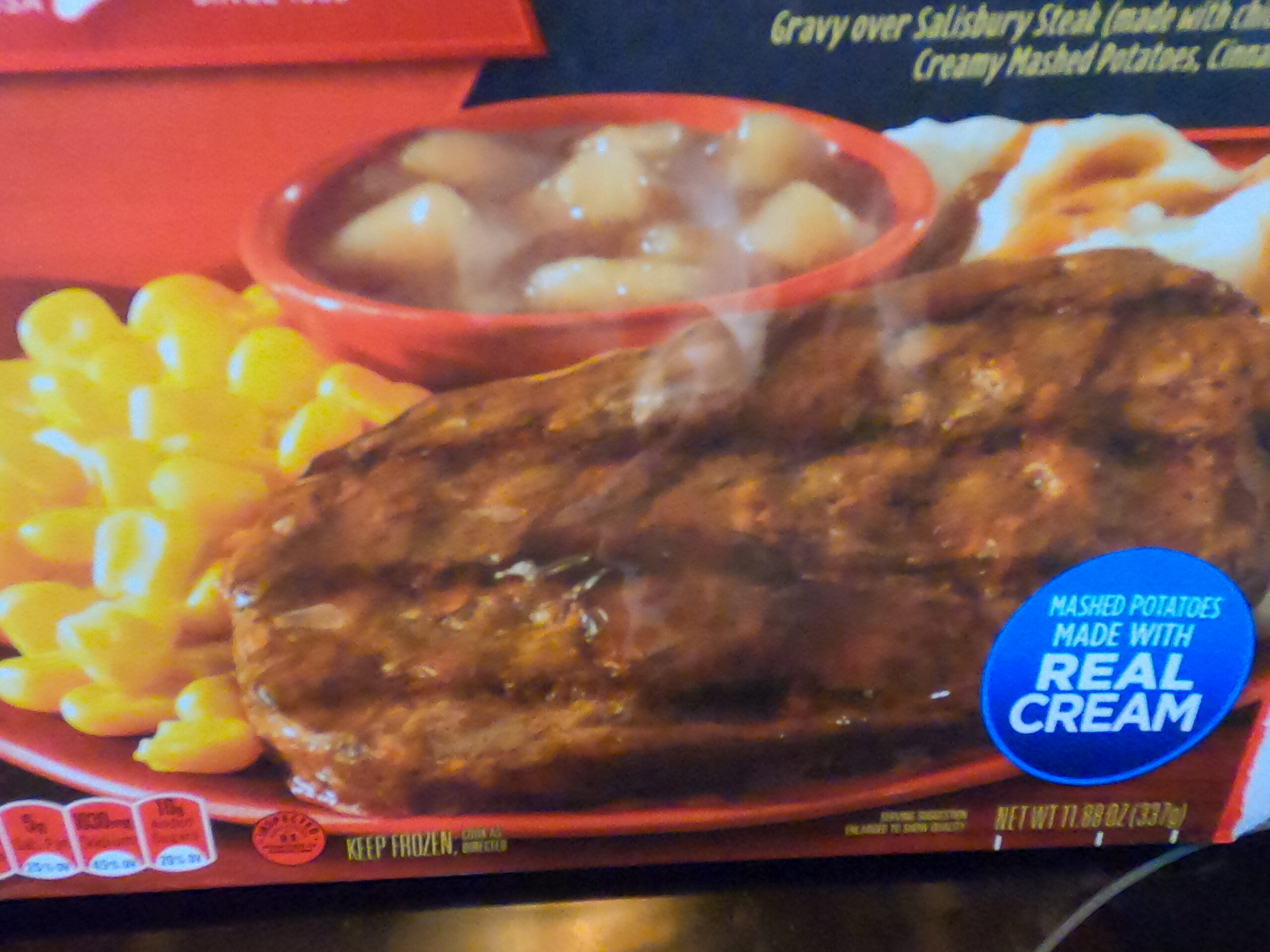 Salisbury Steak Meal has a steak, mashed potatoes, cinnamon apple, sweet corn and gravy. Salisbury steak is made with chicken, pork and beef. Mashed potatoes are creamy and are made with real cream as mentioned on the package. The net weight is 11.88 oz or 337g.