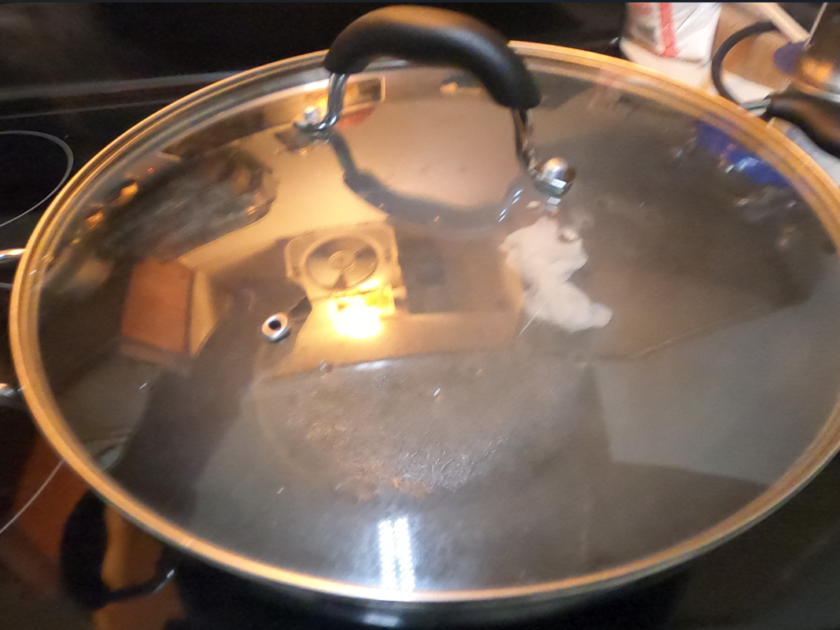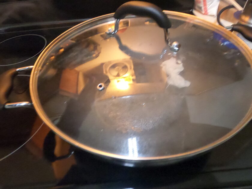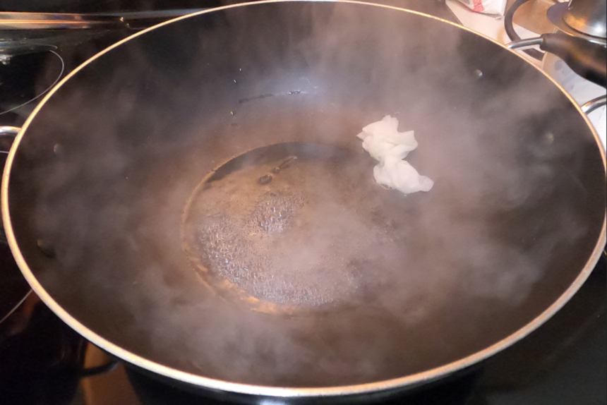 Then, use a paper towel with a pair of chopsticks or a stick or… anything which helps to hold the paper towel so you can move it around to clean the surface of the pan/saucepan/pot.